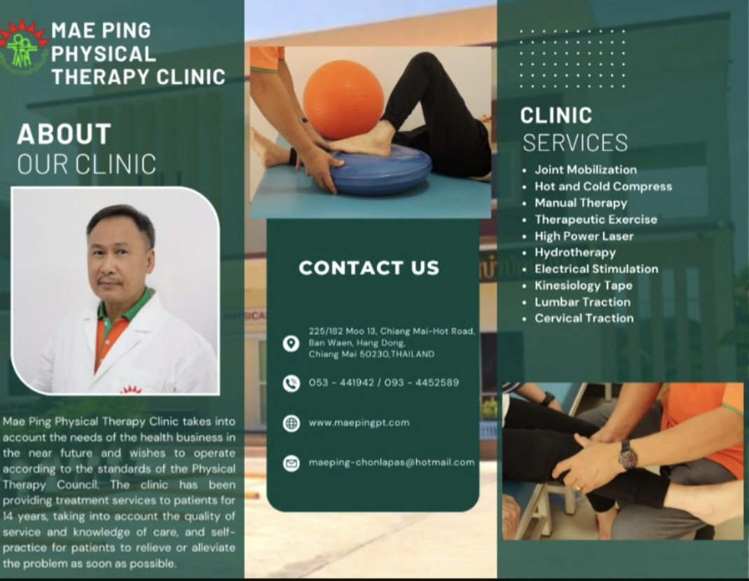 Mae Ping Physical Therapy Clinic and Chonlapas Hydrotherapy were founded on July 11, 1999, at 225/182 Moo 13, Chiang Mai-Hot Road, Bann Wan, Hang Dong, Chiang Mai 50230, Thailand. It was the first private clinic in which the owner and the manager were physical therapists. One studio, 500 square meters occupied with 15 treatment beds and a full-time physical therapist, and Assistant Professor Dr.Prapas Pothongsunun, the director and the owner, was on as a part-time therapist. The clinic has served patients for 14 years the mindful quality and provided patient education on self-care and management for fast relief or recovery.
